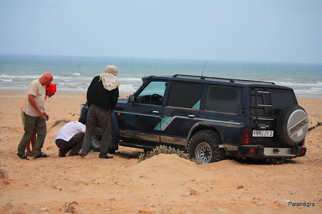 Y este hombre era un marroquí afincado en holanda que estaba de vacaciones, había cogido un todo terreno y pretendía darse un paseo por la arena pero no tenía ni idea de conducirlo. Tuvimos que ayudarlo a sacar el coche de la arena.
